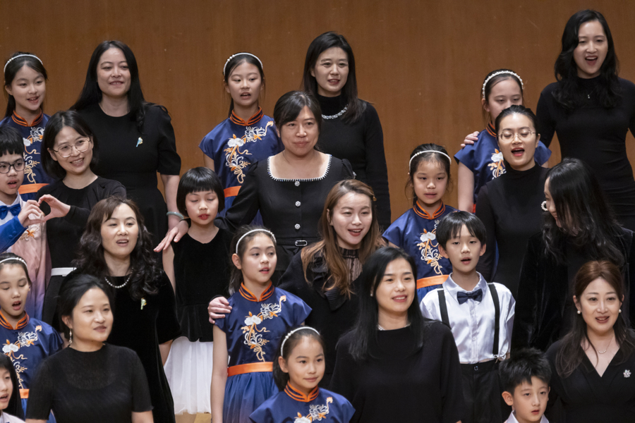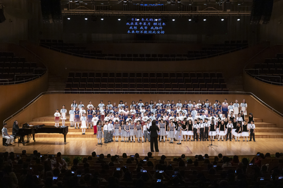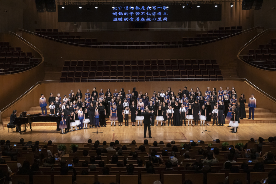 童声合唱团《星河港湾》新年音乐会精选海地民歌、非洲赞歌、葡萄牙语民谣、莫扎特合唱作品等多国曲目,《让我们荡起双桨》《Best Day of My Life》等经典曲目则唤起代际共鸣。演出最后,《遇见》与《稻香》的熟悉旋律缓缓流淌,五团联袂返场演唱父母熟悉的时代金曲,中场休息之际,合唱团成员还邀请妈妈们携手献上一曲《听妈妈的话》,亲子同台共同分享合唱的快乐,展现艺术连接情感的力量。
