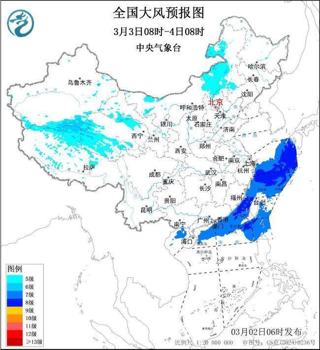 r预计,3月2日08时至3日08时,新疆东部、西藏中西部、青海北部、内蒙古大部、江苏东部等地将有5~6级、阵风7~8级的大风;黄海中部和南部海域、东海大部海域、台湾海峡、台湾以东洋面、南海东北部偏北海域将有7~8级、阵风9级的大风,其中黄海东南部海域、东海北部海域风力可达9~10级、阵风11级。