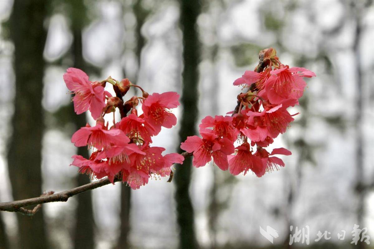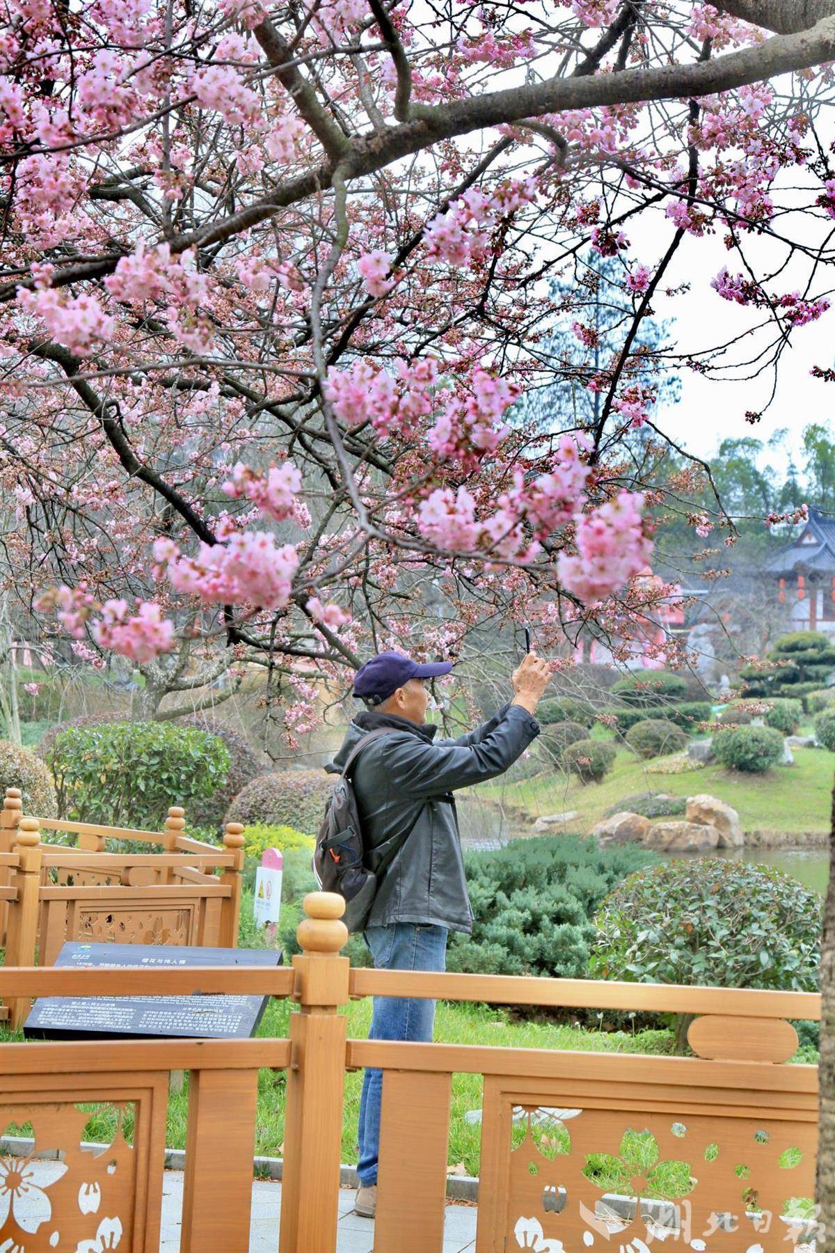 目前,园内早樱如楚天红日、楚天霞光、云南早樱等次第绽放,春意渐浓,景致宜人。“楚天霞光”和“楚天红日”均为“楚樱”品种,以早樱品种福建山樱为父本,与其他樱花杂交培育而成,2月下旬就可开花,是武汉地区花期最早的早樱品种之一。