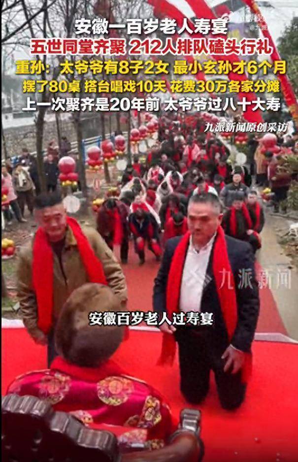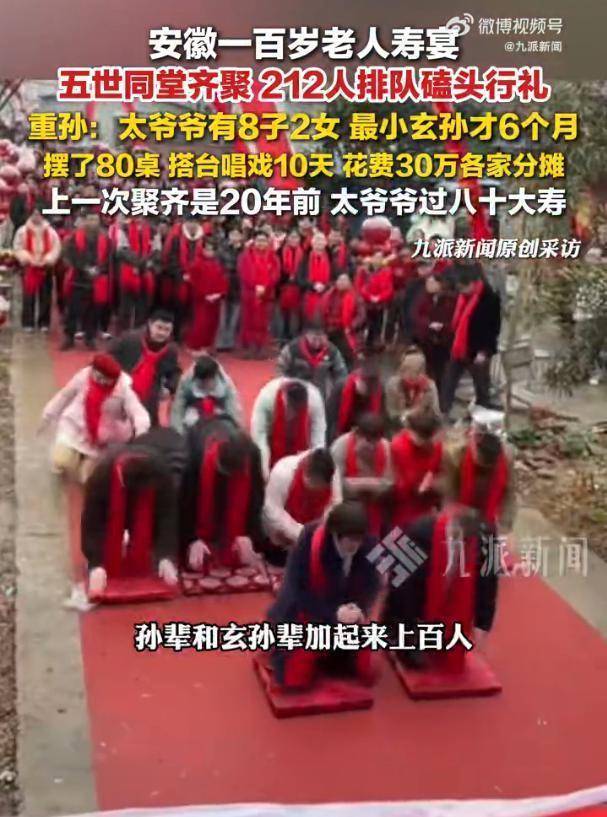 安徽百岁老人过寿宴,五世同堂聚齐,排起长队磕头行礼。